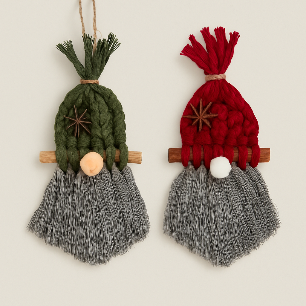 This duo is hand-knotted with bold hats and textured grey beards — complete with cinnamon stick bases and natural accents.