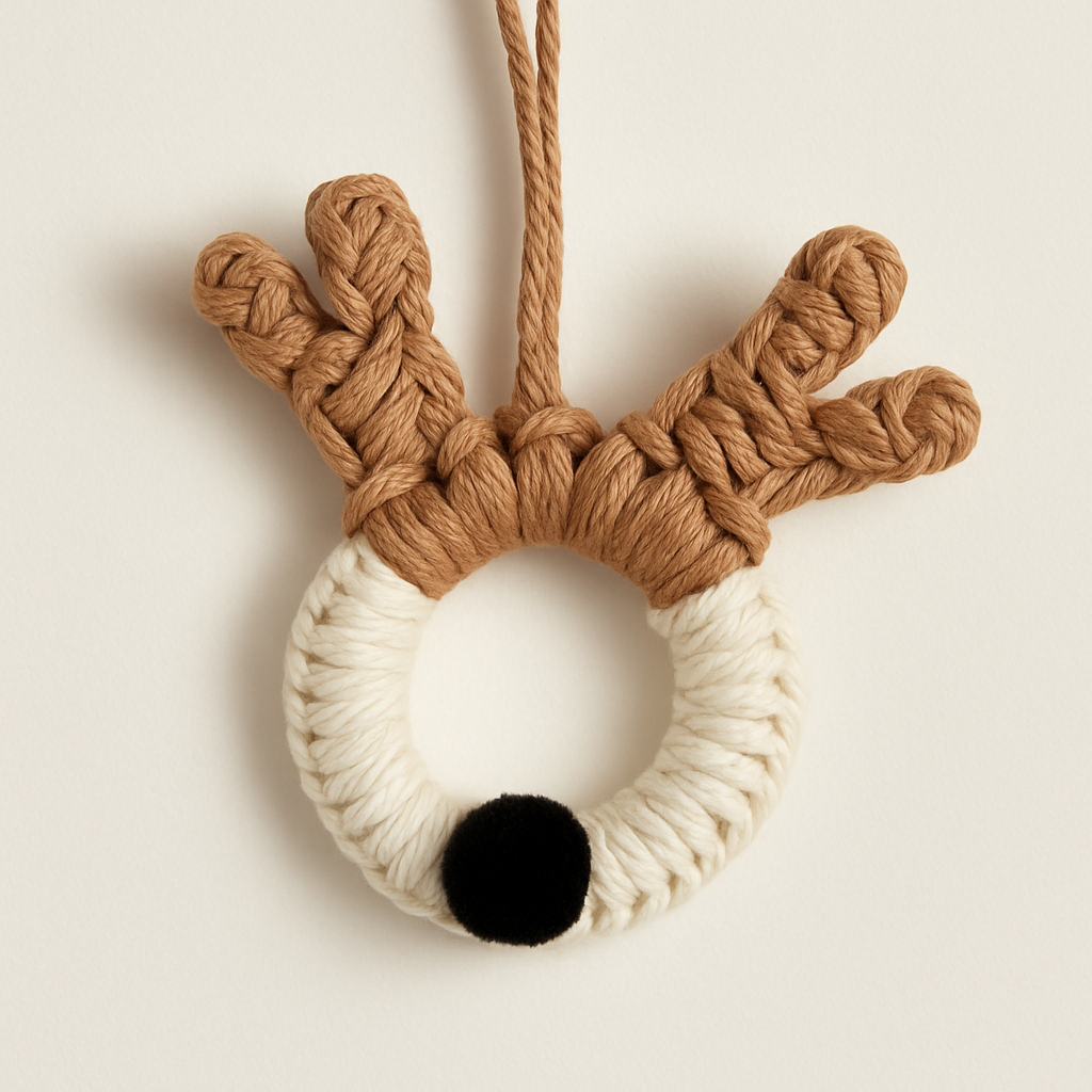 Cute and rustic, this reindeer is made from knotted cotton cord with soft antlers, a cinnamon-toned loop, and a pom-pom nose.